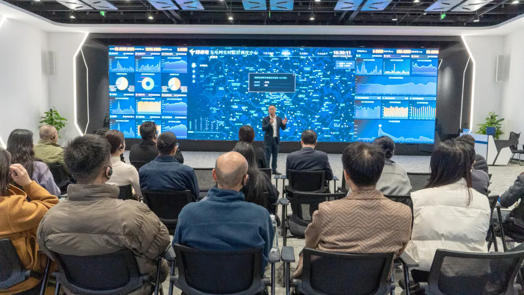 隨后,嘉賓們深入特銳德川開電氣中國(guó)新能源生態(tài)科技館,近距離觀摩了特銳德川開電氣智能低壓開關(guān)柜等明星產(chǎn)品,詳細(xì)聽取了特銳德川開電氣的智慧能源管理系統(tǒng)介紹,了解了智能配電網(wǎng)、源網(wǎng)荷儲(chǔ)一體化、多能互補(bǔ)、充電網(wǎng)和儲(chǔ)能網(wǎng)基礎(chǔ)設(shè)施建設(shè)及虛擬電廠等方面的成果,并在5D能量魔方中感受科技新力量,探索未來(lái)能源城市。在科技館的多功能廳內(nèi),四川特來(lái)電總經(jīng)理武果詳細(xì)介紹了特來(lái)電數(shù)據(jù)大屏。